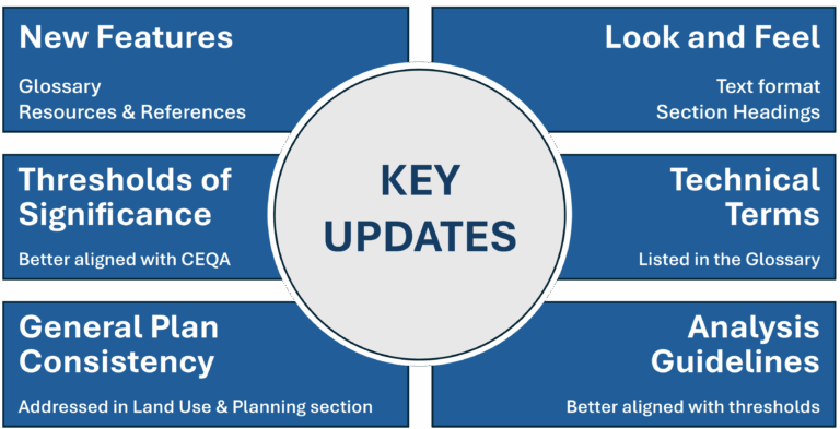 Key updates to the ISAGs include consolidation of sections of similar topics and removing certain sections, alignment with Appendix G in the State CEQA Guidelines, updated thresholds and methods for analyzing potential project impacts (including the Noise and Vibration Assessment Guidelines), and incorporation of certain General Plan programs and policies. Text revisions to some programs and policies are needed to improve clarity, reduce ambiguity, revise references, and where applicable, clarify County processes and procedures. These revisions are proposed as a General Plan Amendment.