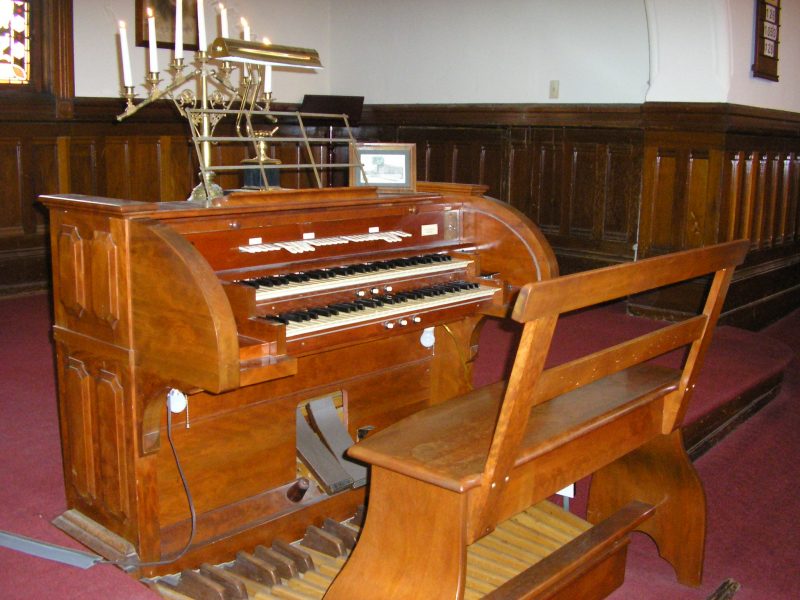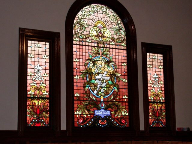 “The interior of the church is designed in the Akron plan with a nearly square shaped room with the floor sloping toward the pulpit at the southwest corner. Seats are arranged in a semi-circle form. The Estey organ was installed in 1924 (see Organ History for more information on organ). The ceiling of the church is redwood as are the doors and all the moulding.” (Universalist Unitarian Church of Santa Paula, n.d.). The stained glass windows were ordered from the Chicago firm of McCulley and Miles in 1891 and were shipped from Chicago by rail.